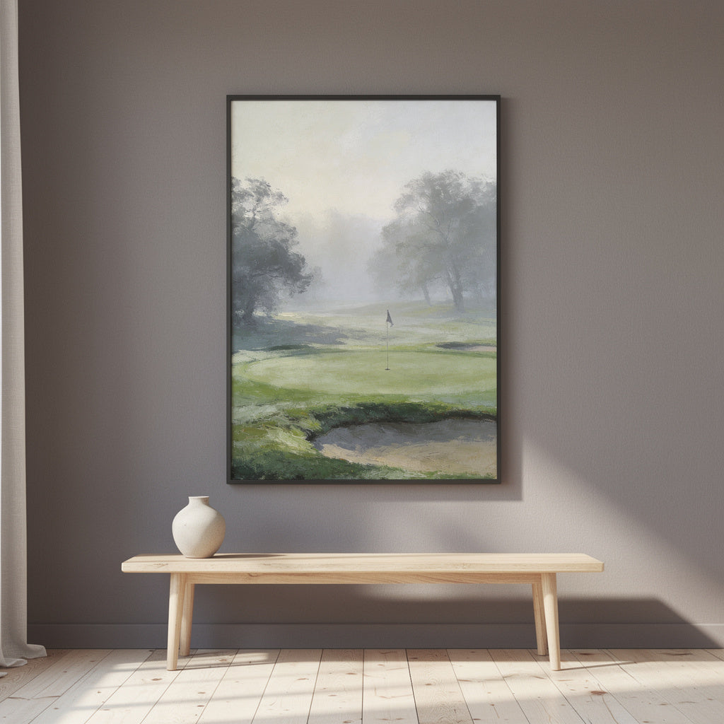 En stillsam golftavla i morgondimma som ger rummet ett lugnt, sofistikerat uttryck.